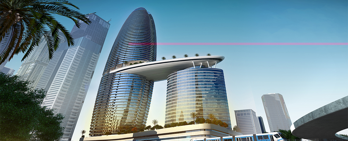 «Грандиозный новый строящийся объект» всего в 500 метрах от морского побережья описан как две башни — 23-этажный отель и 60-этажное жилое здание, соединенные друг с другом «панорамным палубным мостом для отдыха» с «бескрайним бассейном». На сайте было написано, что объект находится на стадии «предварительной сдачи», хотя нынешний его статус неясен.