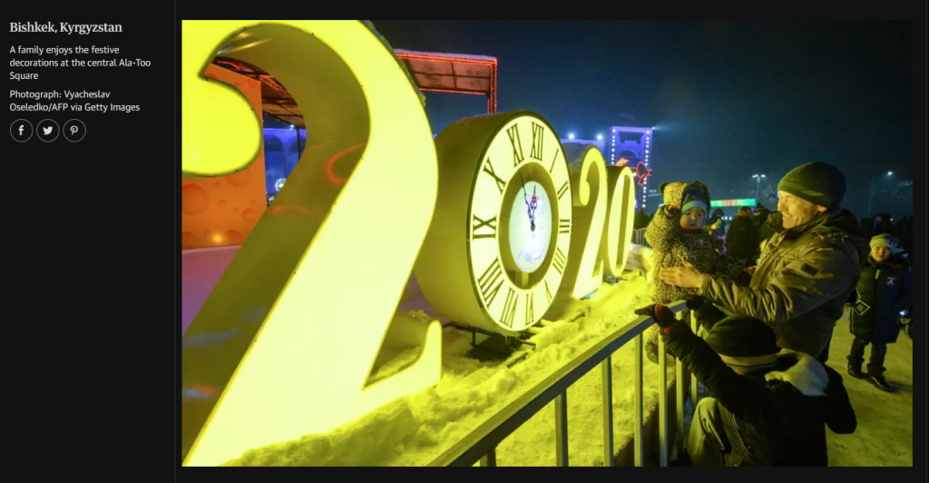 Среди государств Центральной Азии газета выбрала только фотографию Вячеслава Оселедко. «Семья наслаждается праздничным украшением на центральной площади Ала-Тоо» — гласит подпись к снимку.