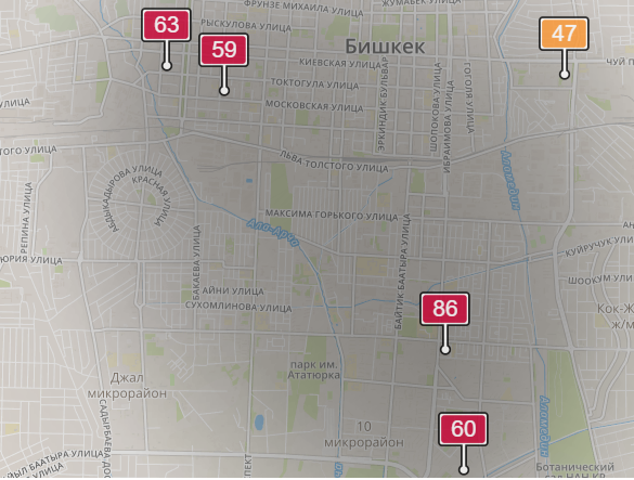 - в районе улиц Бейшеналиевой/Токтогула. Уровень загрязнения превышен в 3,05 раза: PM2.5 среднесуточный — 107 мкг/м³, на момент измерения — 63 мкг/м³;