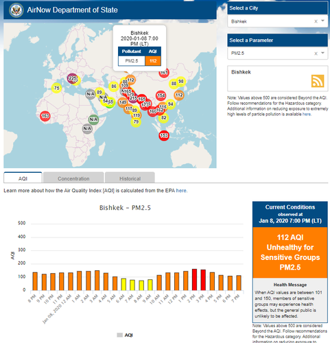 Посольство США в Кыргызстане также установило датчик. Он показывает индекс качества воздуха в режиме онлайн. Информация обновляется ежечасно.