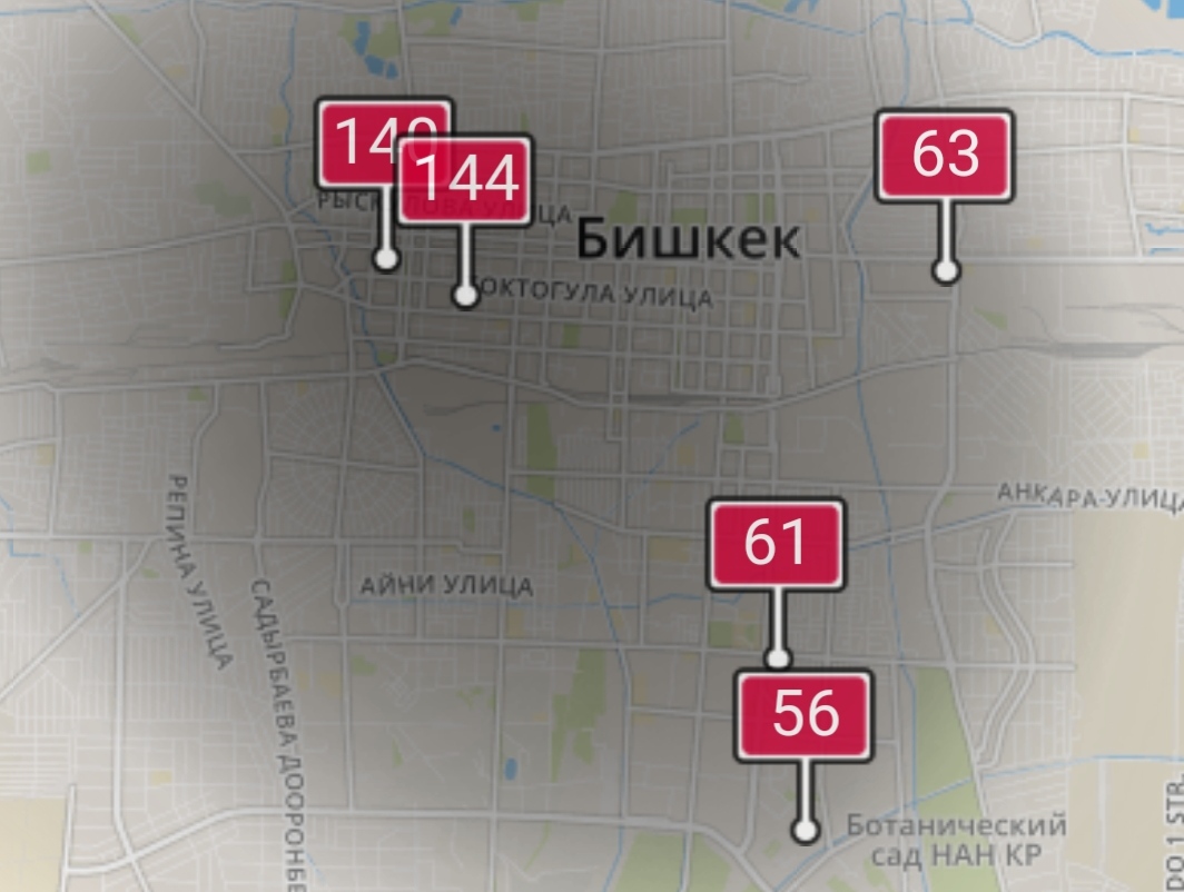 - в районе улиц Бейшеналиевой/Токтогула. Уровень загрязнения превышен в 7,77 раза: PM2.5 среднесуточный — 272 мкг/м³, на момент измерения — 140 мкг/м³;