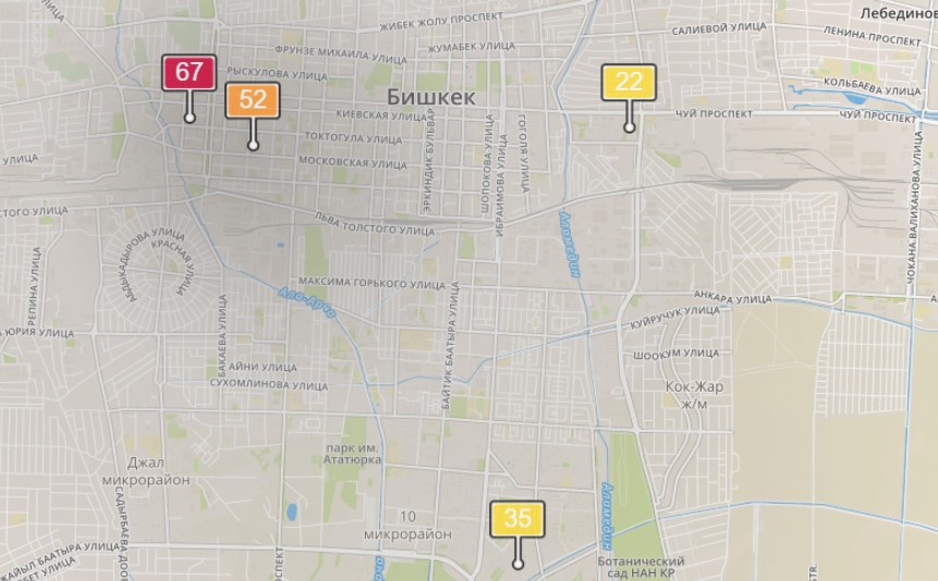 - в районе улиц Бейшеналиевой/Токтогула. Уровень загрязнения превышен в 3,85 раза: PM2.5 среднесуточный — 135 мкг/м³, на момент измерения — 67 мкг/м³;