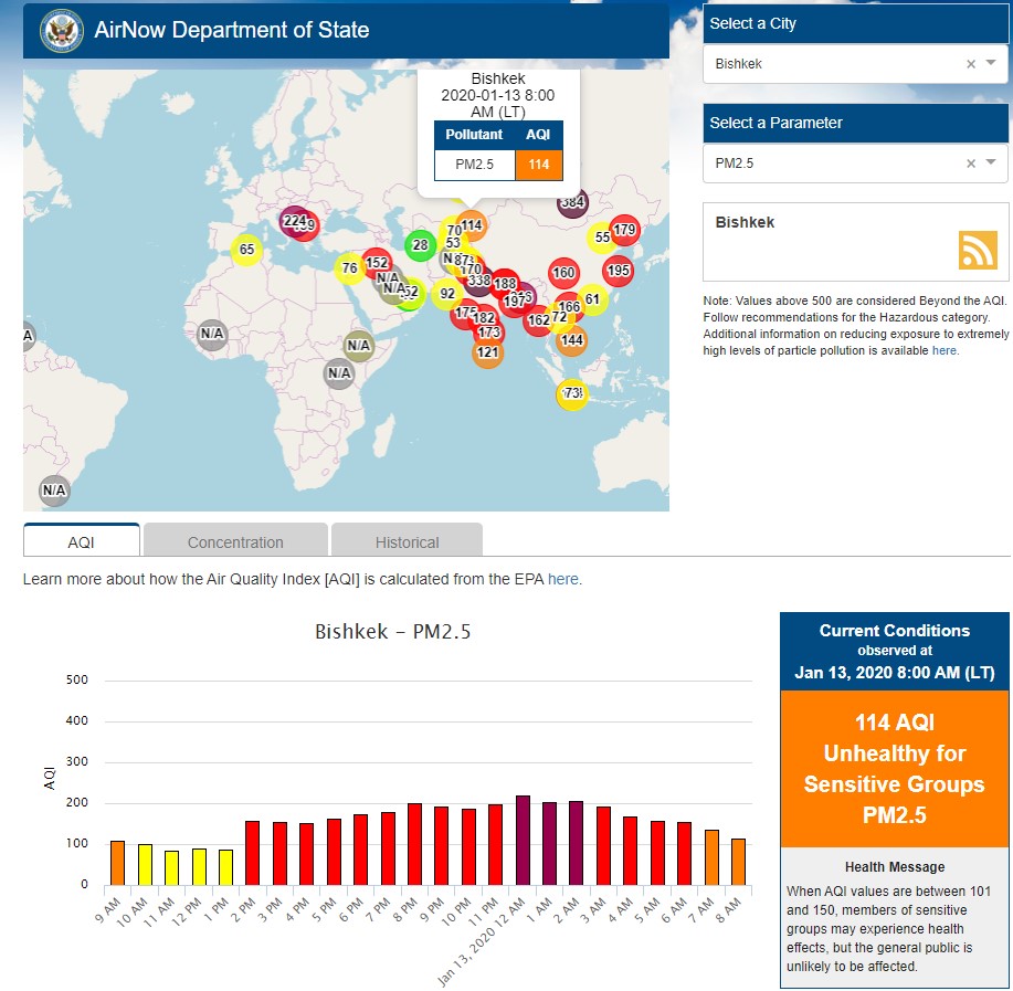 Посольство США в Кыргызстане также установило датчик. Он показывает индекс качества воздуха в режиме онлайн. Информация обновляется ежечасно.