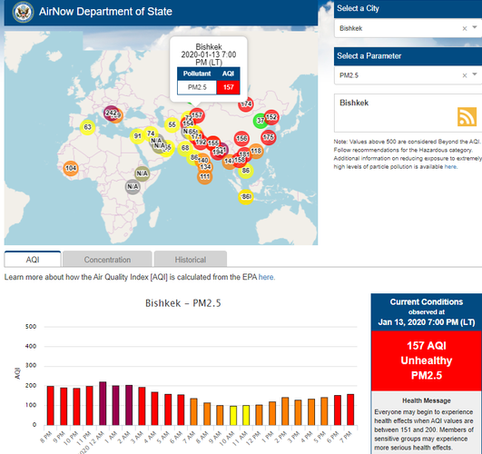 Посольство США в Кыргызстане также установило датчик. Он показывает индекс качества воздуха в режиме онлайн. Информация обновляется ежечасно.