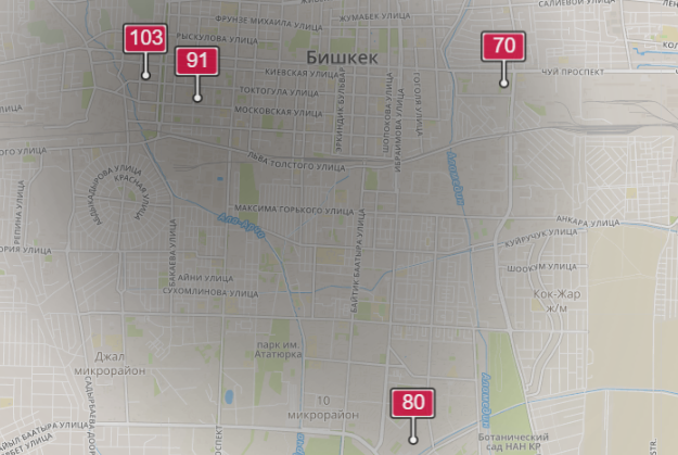 - в районе улиц Бейшеналиевой/Токтогула. Уровень загрязнения превышен в 2,97 раза: PM2.5 среднесуточный — 104 мкг/м³, на момент измерения — 103 мкг/м³;