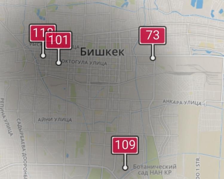 - в районе улиц Бейшеналиевой/Токтогула. Уровень загрязнения превышен в 2,25 раза: PM2.5 среднесуточный — 79 мкг/м³, на момент измерения — 118 мкг/м³;