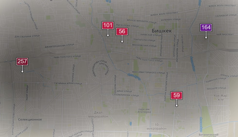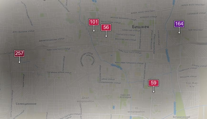 - в районе улиц Бейшеналиевой/Токтогула. Уровень загрязнения превышен в 4,74 раза: PM2.5 среднесуточный — 166 мкг/м³, на момент измерения — 101 мкг/м³;