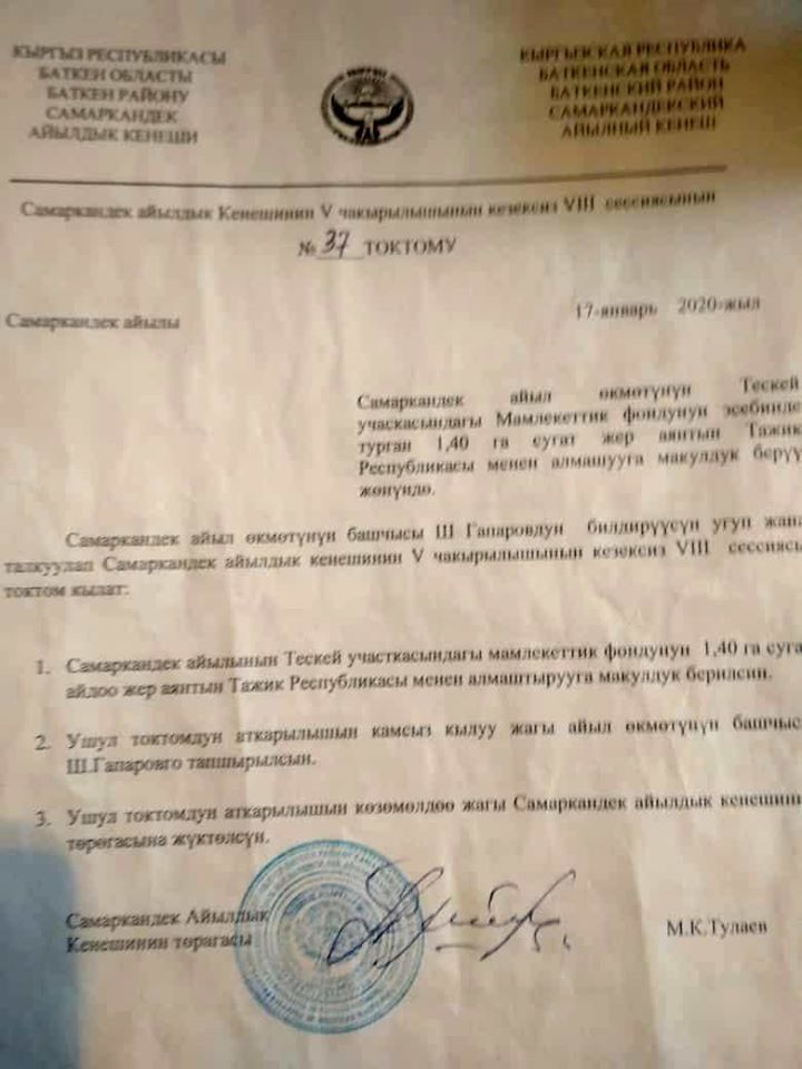 Депутаты Самаркандекского сельского кенеша Баткенского района одобрили передачу 1,4 гектара орошаемой земли Таджикистану. Фото постановления опубликовали в соцсетях.