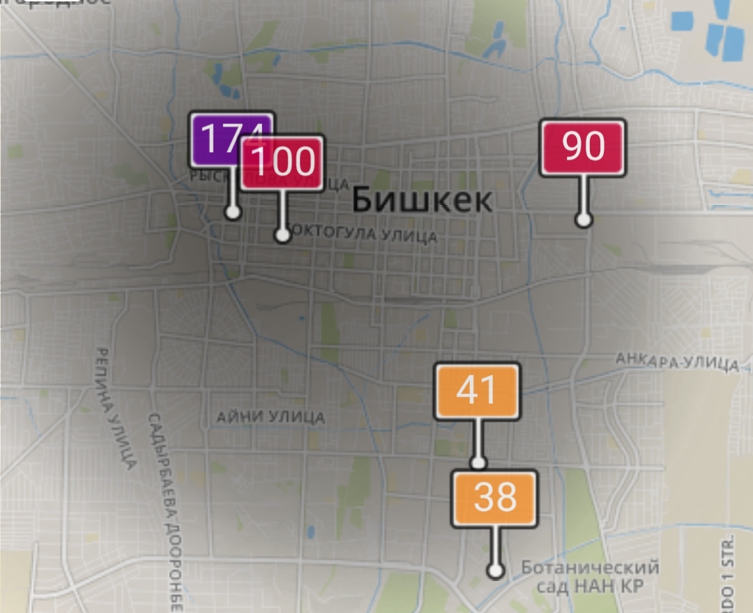 - в районе улиц Бейшеналиевой/Токтогула. Уровень загрязнения превышен в 2 раза: PM2.5 среднесуточный — 70 мкг/м³, на момент измерения — 174 мкг/м³;