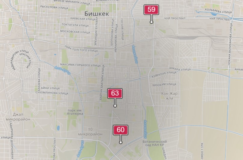 - в районе улиц Жукеева-Пудовкина/Койбагарова. Уровень загрязнения превышен в 1,94 раза: PM2.5 среднесуточный — 68 мкг/м³, на момент измерения — 63 мкг/м³;