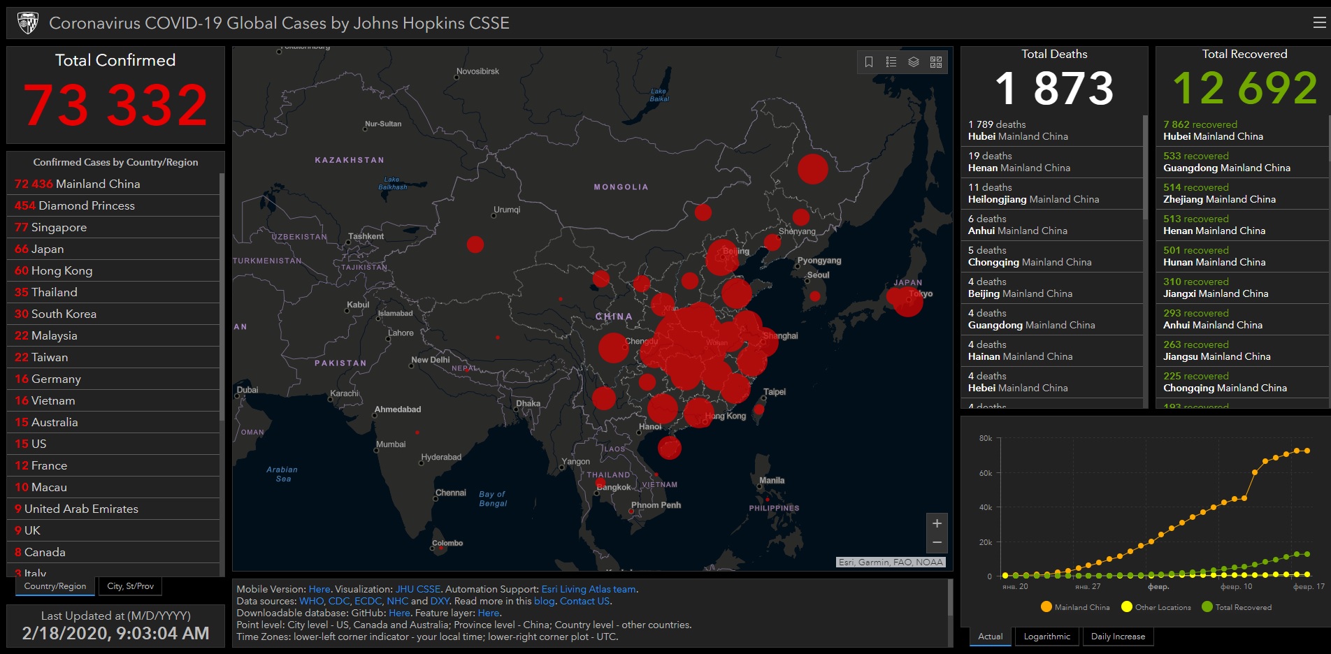 За последние сутки число людей, которые заразились новым коронавирусом в Китае, достигло 73 тысяч 332 человек. За последние сутки число подтвержденных случаев болезни выросло на 2 тысячи человек.