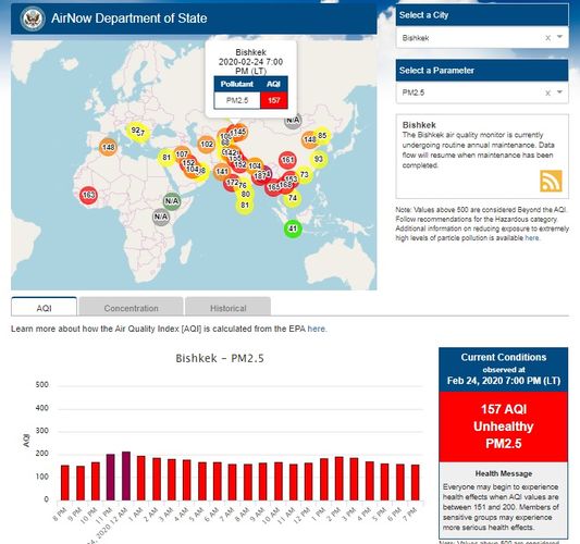 Посольство США в Кыргызстане также установило датчик. Он показывает индекс качества воздуха в режиме онлайн. Информация обновляется ежечасно.