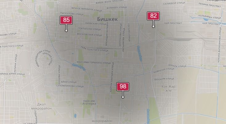 - в районе улиц Московской/Уметалиева. Уровень загрязнения превышен в 6,2 раза: PM2.5 среднесуточный —217 мкг/м³, на момент измерения — 85 мкг/м³;