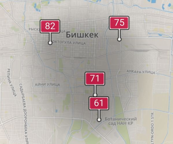 - в районе улиц Московской/Уметалиева. Уровень загрязнения превышен в 1,86 раза: PM2.5 среднесуточный — 65 мкг/м³, на момент измерения — 82 мкг/м³;
