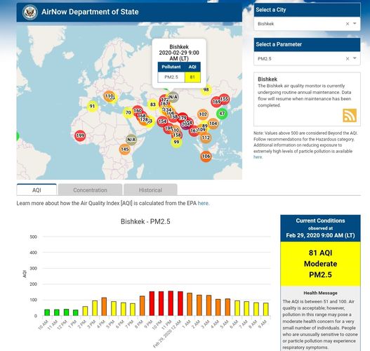 Посольство США в Кыргызстане также установило датчик. Он показывает индекс качества воздуха в режиме онлайн. Информация обновляется ежечасно.