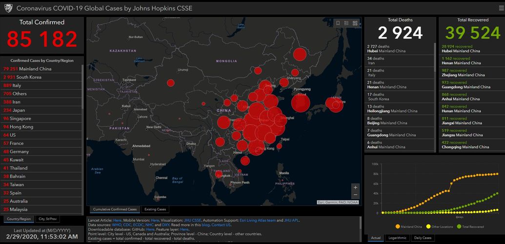Общее число заразившихся новым коронавирусом достигло 85 тысяч 182 человек. Об этом свидетельствуют данные онлайн-карты, разработанной учеными.