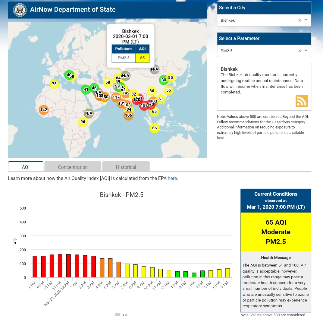 Посольство США в Кыргызстане также установило датчик. Он показывает индекс качества воздуха в режиме онлайн. Информация обновляется ежечасно.