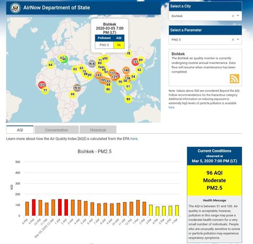 Посольство США в Кыргызстане также установило датчик. Он показывает индекс качества воздуха в режиме онлайн. Информация обновляется ежечасно.