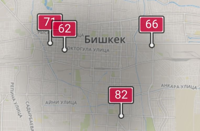 - в районе улиц Бейшеналиевой/Токтогула. Уровень загрязнения превышен в 3,23 раза: PM2.5 среднесуточный — 113 мкг/м³, на момент измерения — 71 мкг/м³;