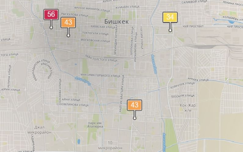 - в районе улиц Бейшеналиевой/Токтогула. Уровень загрязнения превышен в 1,66 раза: PM2.5 среднесуточный — 58 мкг/м³, на момент измерения — 56 мкг/м³;