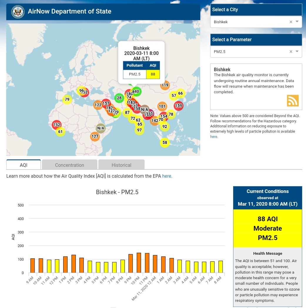 Посольство США в Кыргызстане также установило датчик. Он показывает индекс качества воздуха в режиме онлайн. Информация обновляется ежечасно.