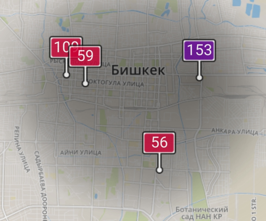 - в районе улиц Бейшеналиевой/Токтогула. Уровень загрязнения превышен в 2,2 раза: PM2.5 среднесуточный — 77 мкг/м³, на момент измерения — 109 мкг/м³;