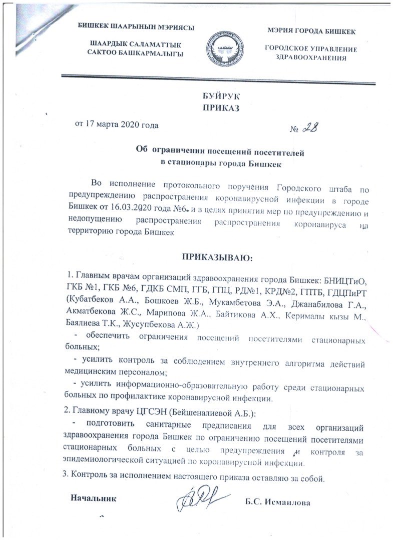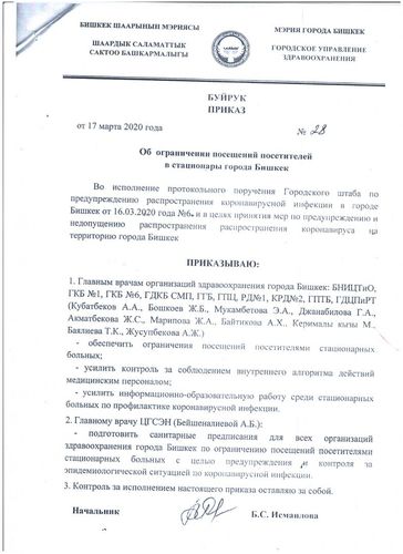 В стационарах Бишкека введено ограничение на посещение посетителей лечебных стационаров. Решение принято на заседании городского штаба по предупреждению и недопущению распространения коронавирусной инфекции, сообщает офицальный Twitter-аккаунт столичной мэрии.