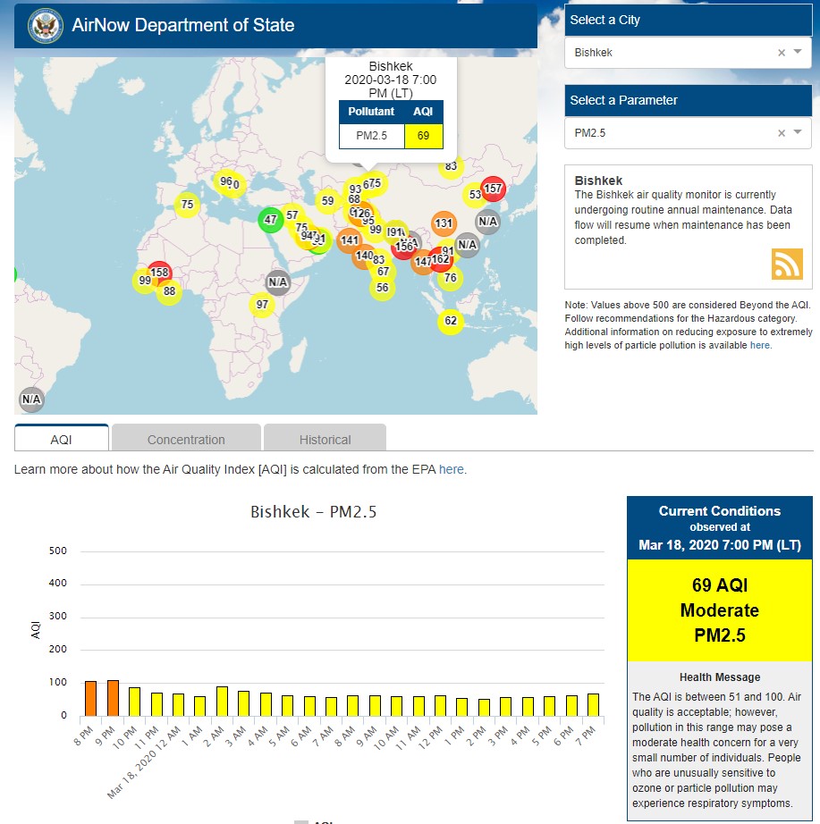 Посольство США в Кыргызстане также установило датчик. Он показывает индекс качества воздуха в режиме онлайн. Информация обновляется ежечасно.