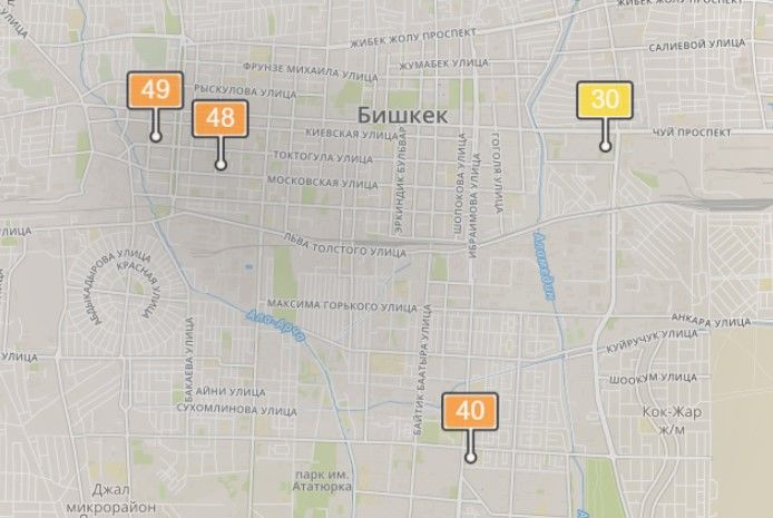 - в районе улиц Бейшеналиевой/Токтогула. Уровень загрязнения превышен в 1,17 раза: PM2.5 среднесуточный — 41 мкг/м³, на момент измерения — 49 мкг/м³;