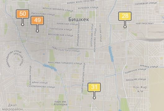 - в районе улиц Бейшеналиевой/Токтогула. Уровень загрязнения не превышен: PM2.5 среднесуточный — 22 мкг/м³, на момент измерения — 50 мкг/м³;