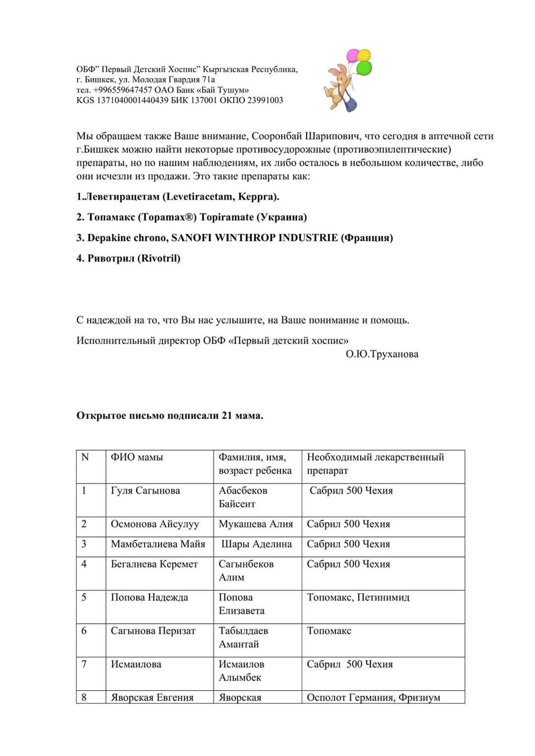 Они просят Сооронбая Жээнбекова помочь во включении препаратов в перечень жизненно важных лекарственных средств КР. И как вариант решения сложившейся проблемы произвести прямую государственную закупку незарегистрированных противосудорожных (противоэпилептических) препаратов, которые успешно и законно используют врачи во всем мире.
