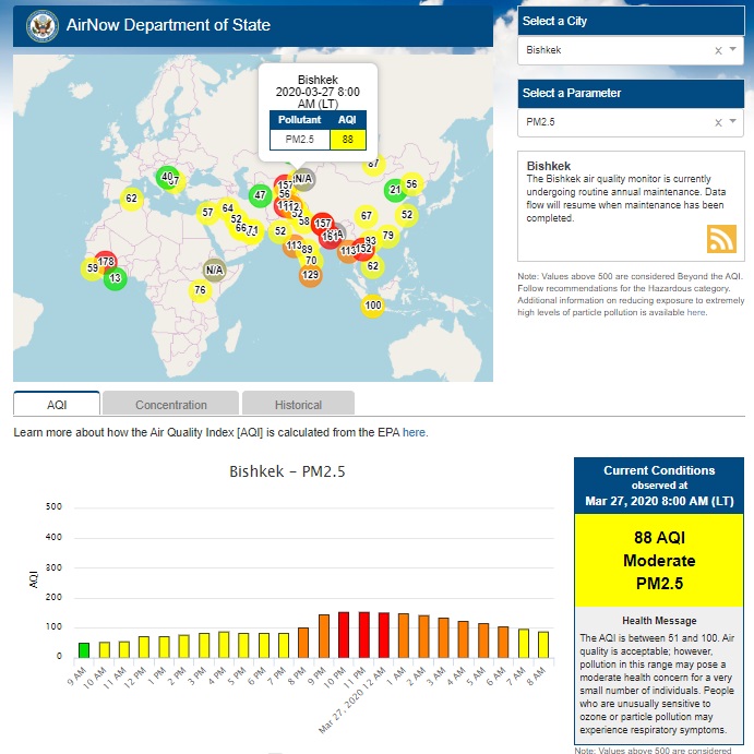 Посольство США в Кыргызстане также установило датчик. Он показывает индекс качества воздуха в режиме онлайн. Информация обновляется ежечасно.