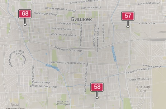 - в районе улиц Бейшеналиевой/Токтогула. Уровень загрязнения превышен в 2,06 раза: PM2.5 среднесуточный — 72 мкг/м³, на момент измерения — 68 мкг/м³;