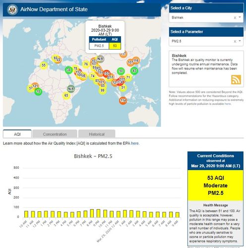 Посольство США в Кыргызстане также установило датчик. Он показывает индекс качества воздуха в режиме онлайн. Информация обновляется ежечасно.