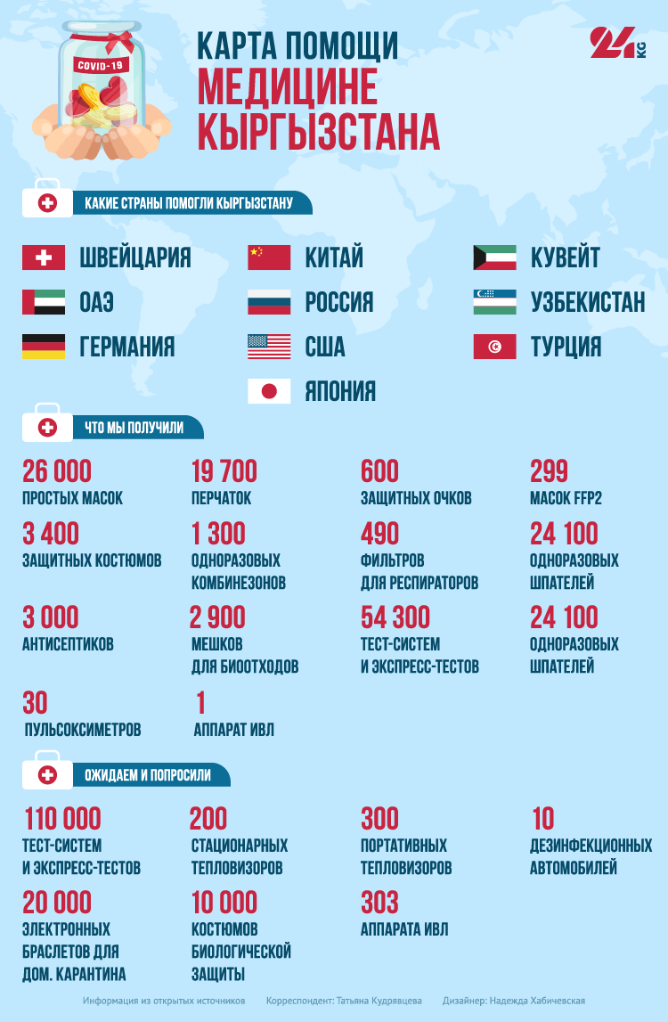 Первая помощь начала поступать в Кыргызстан задолго до регистрации случаев заболевания коронавирусом. Сначала — медицинские маски и перчатки, которых стало остро не хватать в аптеках и у медиков. Дальше — больше: защитные костюмы, аппараты искусственной вентиляции легких, тест-системы.
