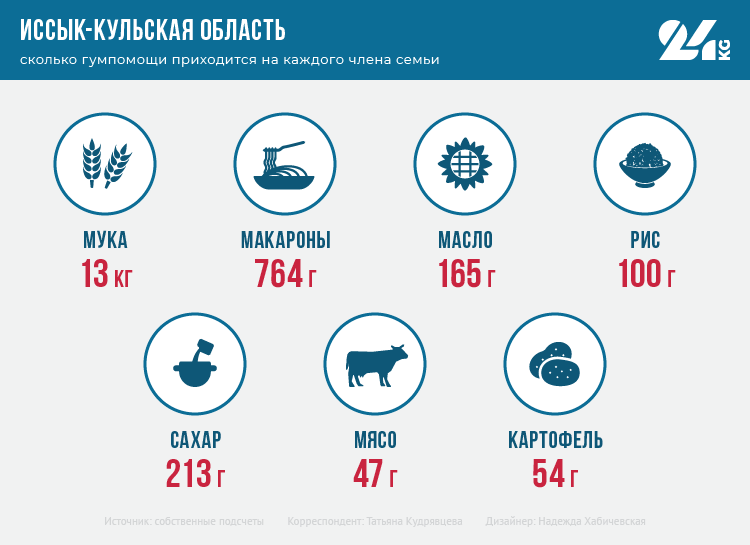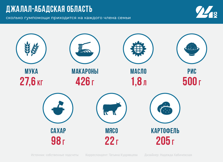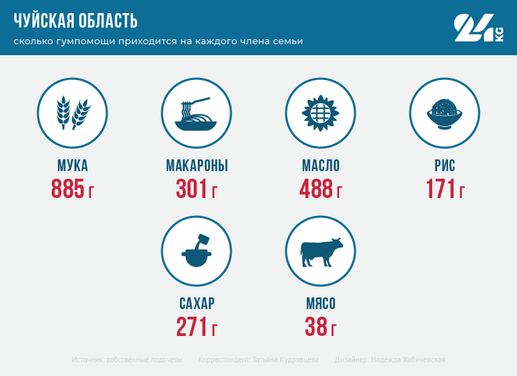 В регионе на каждую семью пришлось по 39 килограммов муки, 7 килограммов риса, 3,7 килограмма макарон и 2 литра масла. А вот мяса малоимущим семьям также досталось крайне мало — лишь 640 граммов. Это гораздо больше, чем в Ошской и Джалал-Абадской областях.