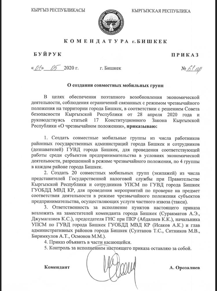 В Бишкеке создали 20 мобильных групп для проверки субъектов предпринимательства, осуществляющих услуги частного извоза (такси). Об этом говорится в приказе коменданта Алмаза Орозалиева.