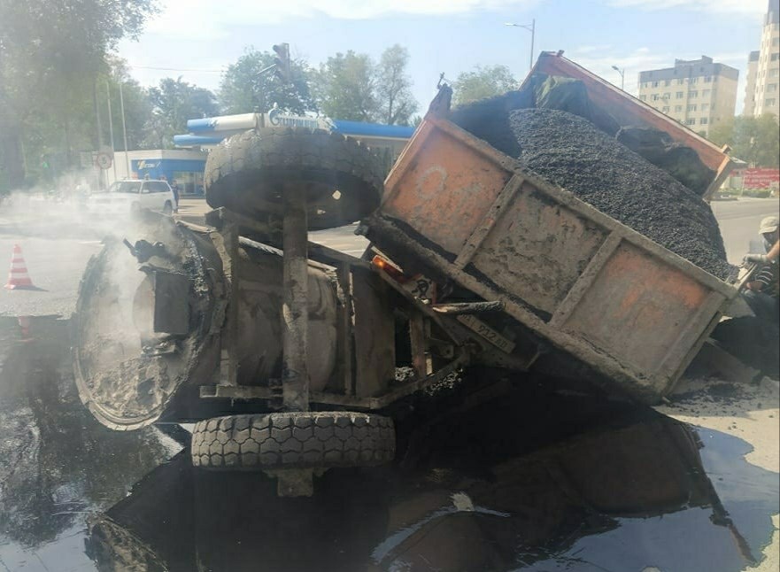 На кадрах видно, что он вез за собой прицепом бочку, скорее всего, с битумом. После происшествия черная жидкость вылилась на дорогу. В кузове грузовой машины находился асфальт.