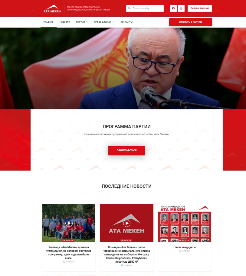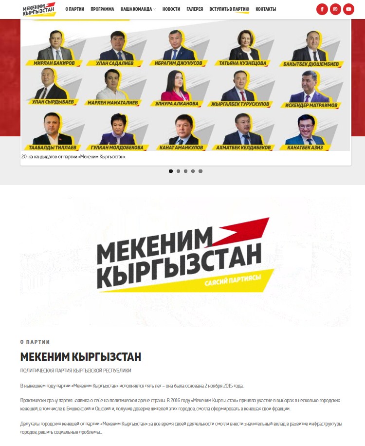 У политической партии «Мекеним Кыргызстан» два сайта. На первом ресурсе mekenimkyrgyzstan.kg опубликованы список кандидатов, история политорганизации и ее последние новости. В разделе «Галерея» фотографии только со съезда партии. Свои контакты она не афиширует, но ей можно написать обращение, возможно, ответит. Чтобы вступить в политобъединение, достаточно указать ФИО и электронный адрес, никаких анкет нет. В разделе новостей всего восемь публикаций, они сделаны с 12 по 22 августа. Программу партия еще не опубликовала.