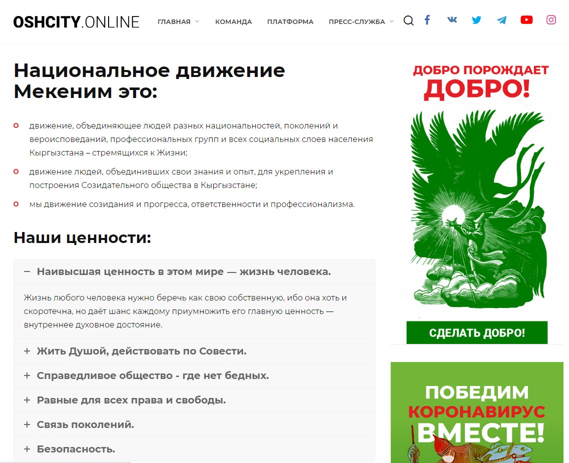 Второй портал oshcity.online создан для набора волонтеров. Здесь «Мекеним Кыргызстан» позиционирует себя национальным движением. На сайте указываются ценности объединения, размещены имена и фамилии членов сообщества. Кстати, на этом ресурсе тоже можно зарегистрироваться и присоединиться к партии.