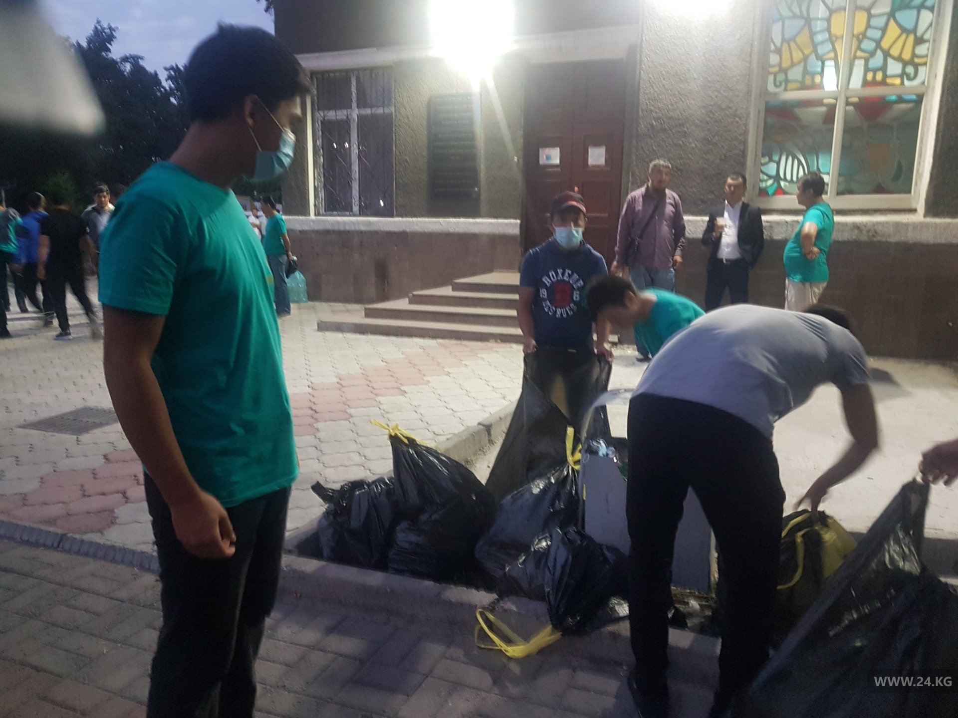 Они собрали бумажные стаканчики, окурки, салфетки в черные мешки и оставили их возле урн. «Работники «Тазалыка», наверное, заберут утром мешки, мы не знаем, куда отвозить, но мы все убрали на площади у здания ВС», — сказали митингующие.