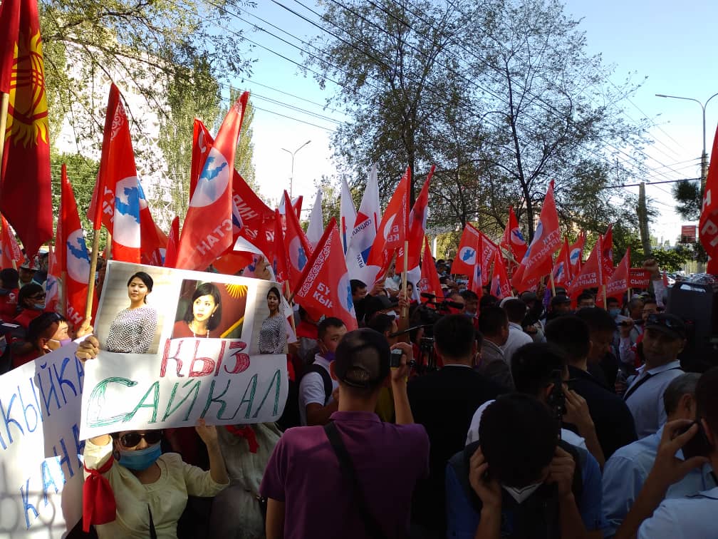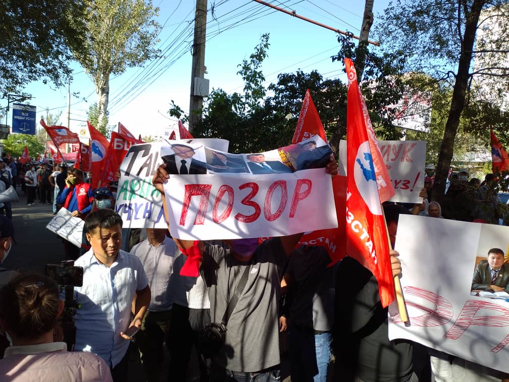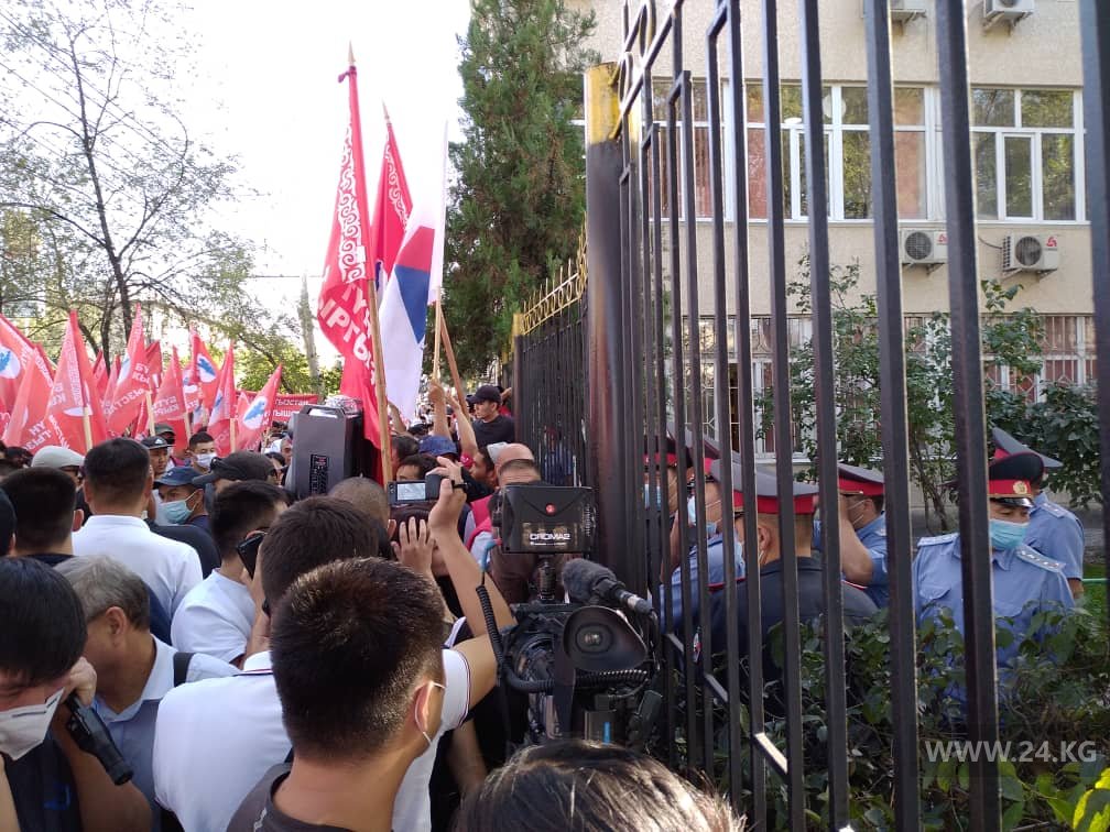 Возле здания суда, где рассматривается жалоба партии «Бутун Кыргызстан» на решение ЦИК, проходит митинг.