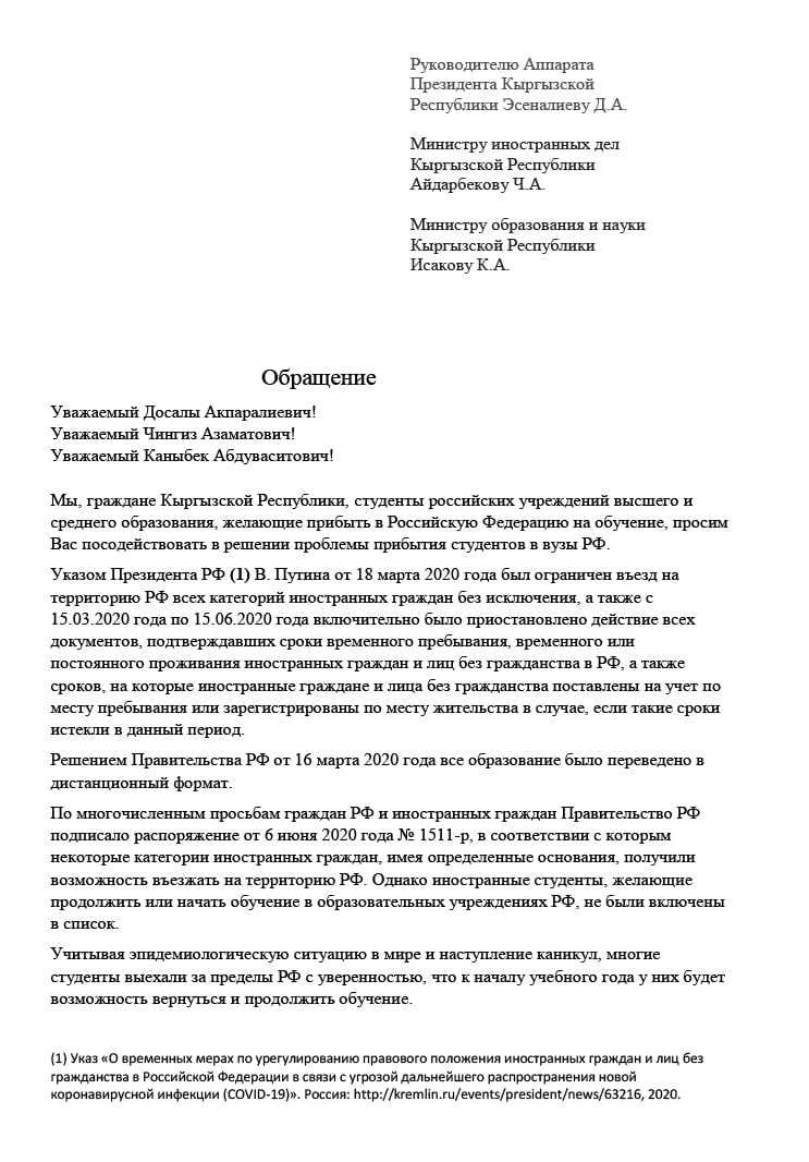 «На протяжении месяца мы пытались получить ответ от правительства, консульства и МИД РФ в Кыргызстане, Министерства образования и науки, служащих контрольно-пропускных пунктов и других уполномоченных органов на вопрос о том, когда будут открыты границы России для иностранных студентов. Учебный год начался, однако тысячи студентов остались без ответа», — говорится в письме.