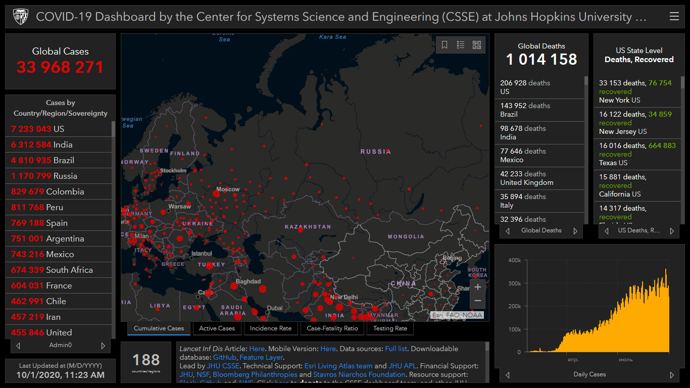 Всего в мире коронавирусом заразились 33 миллиона 968 тысяч 271 человек. Больше всего зараженных в США (7 миллионов 233 тысячи 43), Индии (6 миллионов 312 тысяч 584), Бразилии (4 миллиона 810 тысяч 935), России (1 миллион 170 тысяч 799), Колумбии (829 тысяч 679), Перу (811 тысяч 768), Испании (769 тысяч 188), Аргентине (751 тысяча 1) и Мексике (743 тысячи 216).