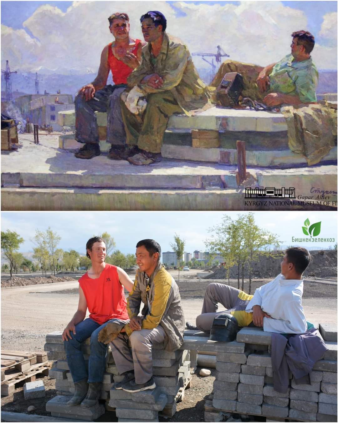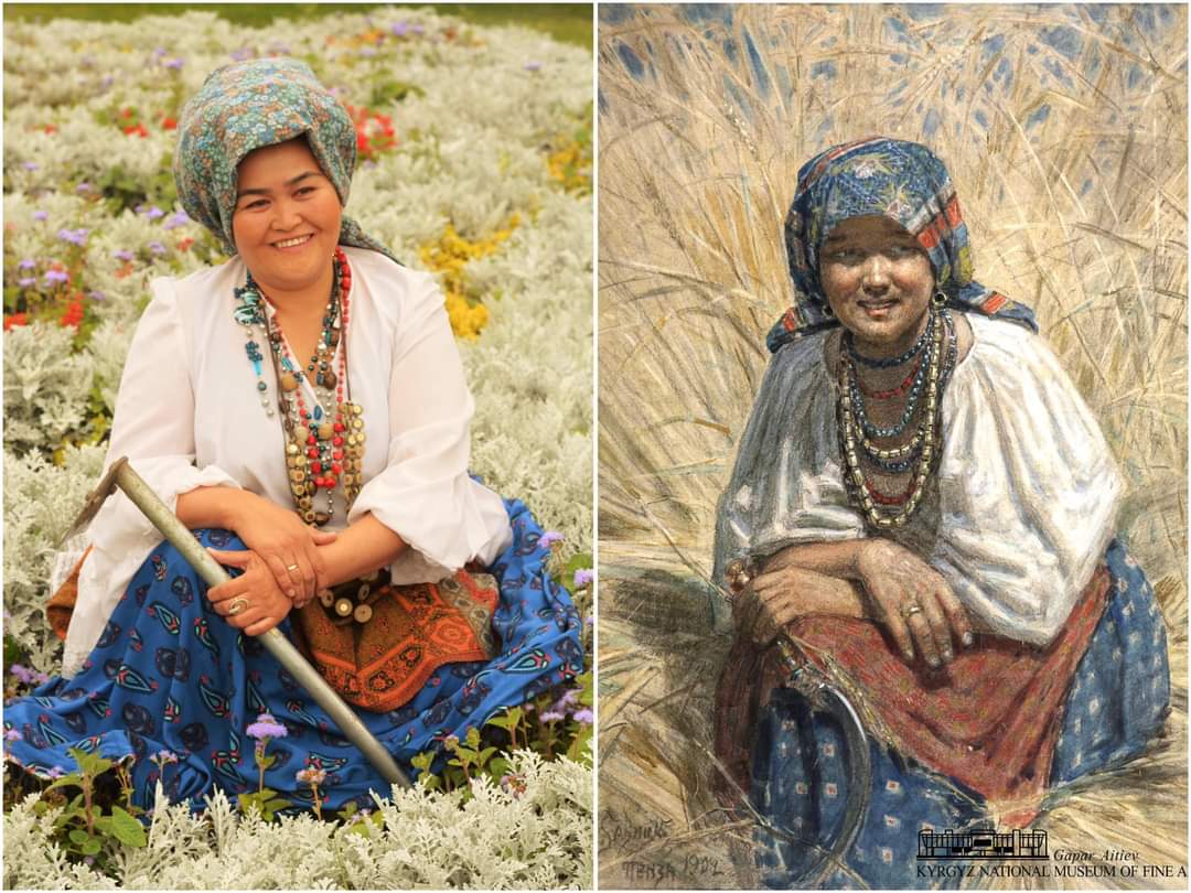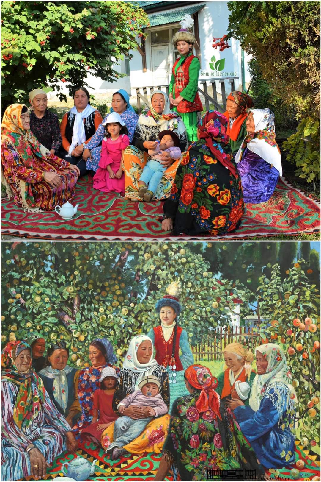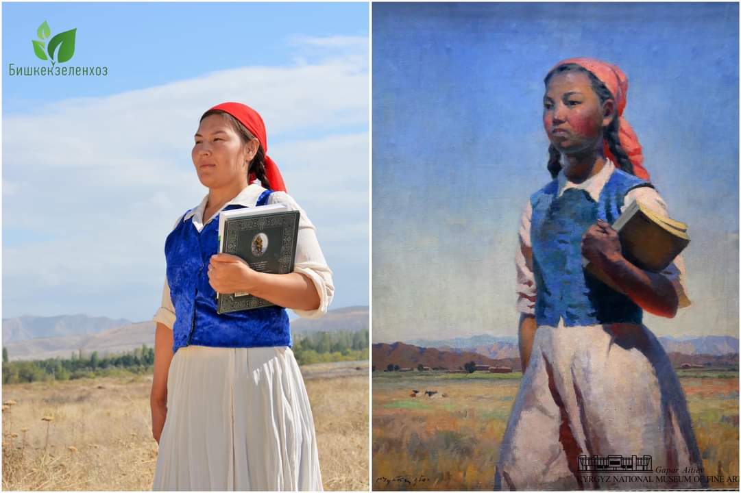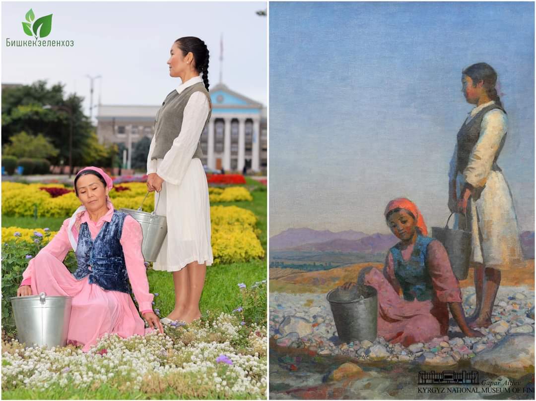 Уточняется, что поливщики, косильщики, работники теплиц и цветочных клумб примерили на себя образ известной «Дочери Советской Киргизии» Семена Чуйкова, «Аннушки» Савицкого, женщин в национальных убранствах с картины «Праздник» Суймонкула Чокморова.