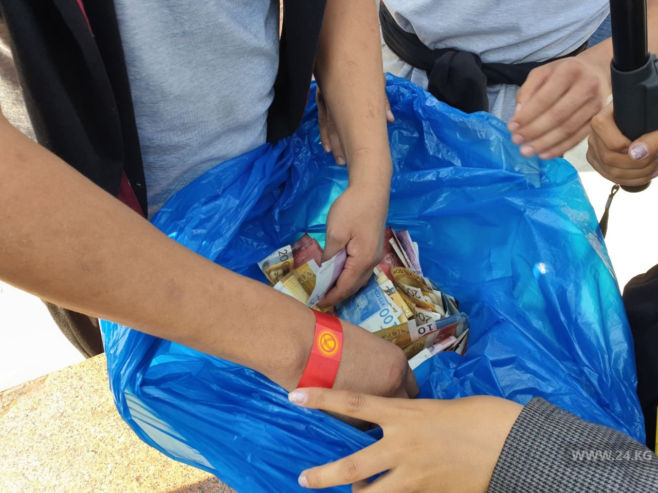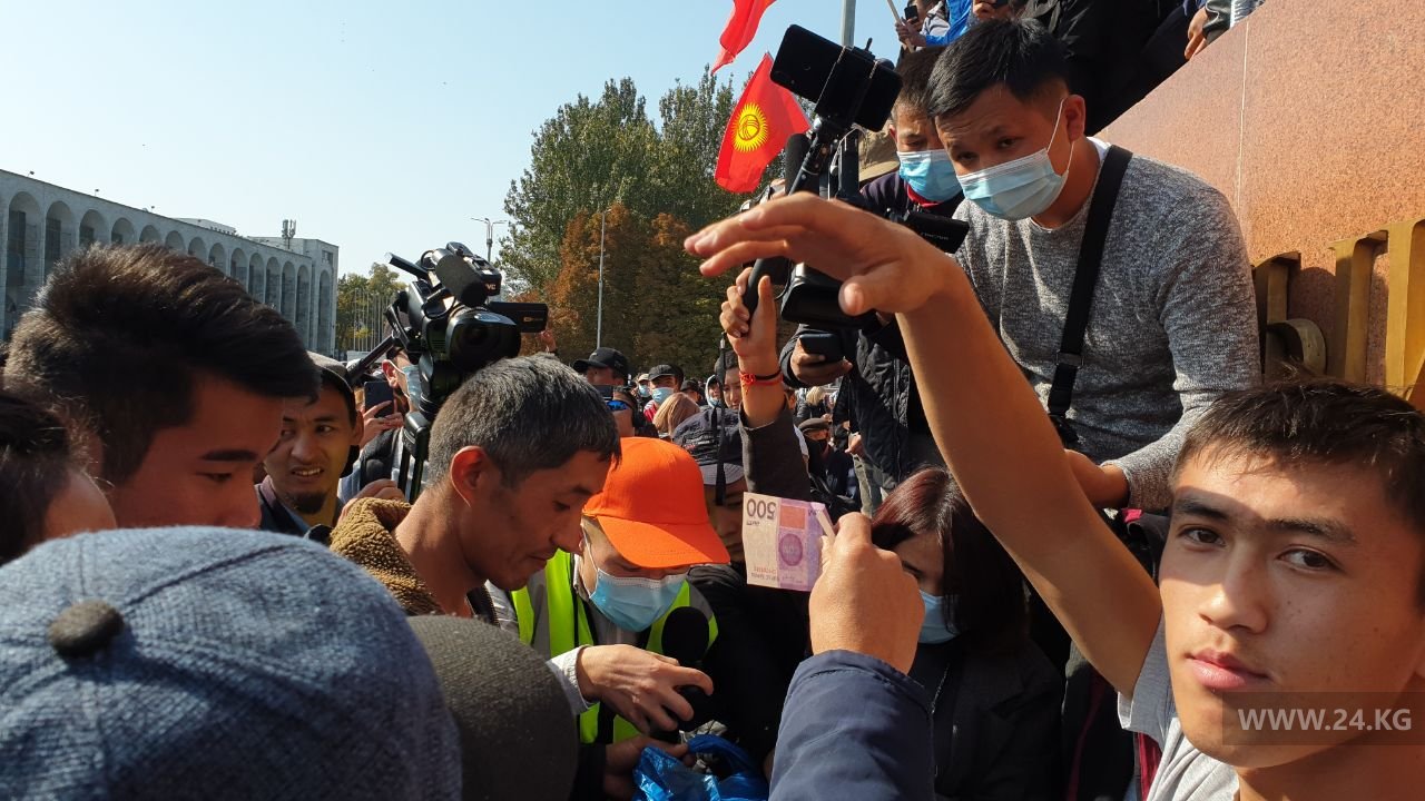 После этого митингующие стали бросать деньги в специальный пакет. Сыймык Жапыкеев заявил, что за едой и напитками пойдут опредеденные люди, которые принесут провизию. Как стало известно, в общей сложности митингующие собрали 44 тысячи сомов.