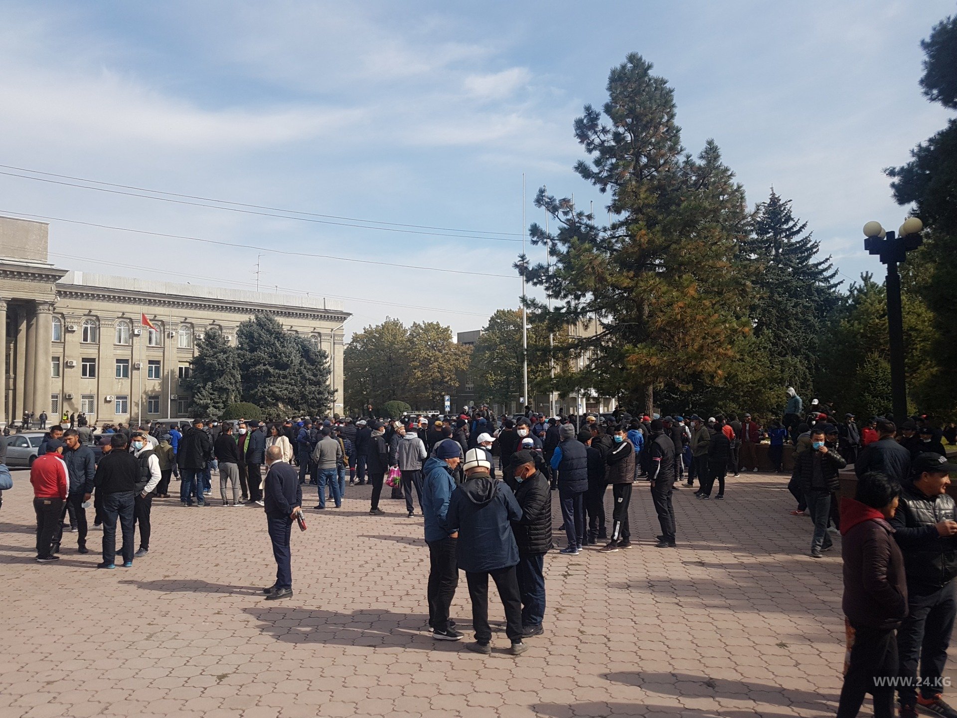 К Дому правительства подъехала группа мужчин в спортивной одежде. Они рассказали журналисту 24-kg.com, что приехали с Иссык-Куля, являются народными дружинниками.