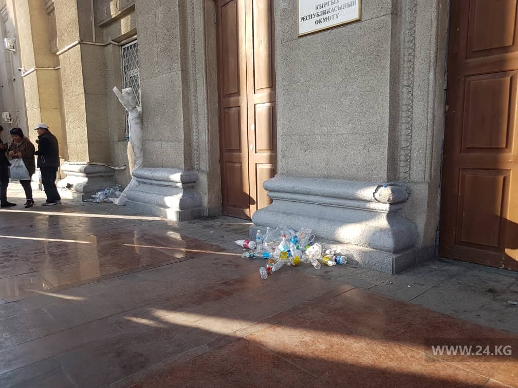 Сообщается, что на акции протеста женщины собирают мусор. Однако кучи пустых пластиковых бутылок прямо у главного входа в Дом правительства никто не убирает.