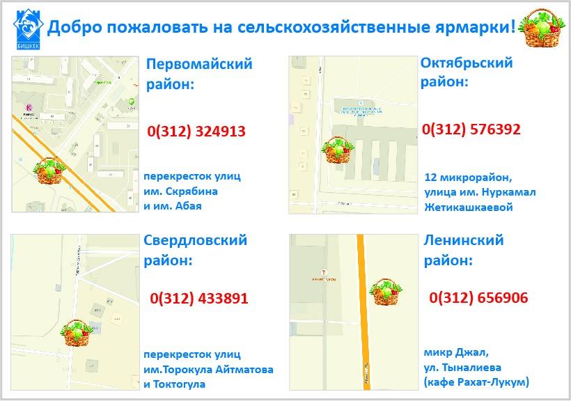 - в Первомайском районе ярмарка развернется на пересечении улиц Скрябина и Абая (рядом с Кыргызским национальным аграрным университетом им. К.И.Скрябина);