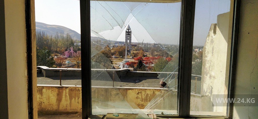 С последнего, восьмого этажа «Иссык-Куля», где прежде был бар, открывается отличный вид на горы и двор гостиницы. Здесь же сквозь разбитые окна хорошо виден и соседствующий с комплексом этно-городок «Манас айылы», пребывающий сегодня в таком же убогом виде.